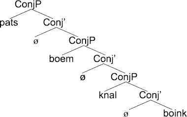 Corver (2015; 2023) hypothesizes that Dutch ideophonic sequences such as (5a–d) above have internal syntactic complexity. Assuming that ideophones are lexical roots that, like other lexical elements, project complex phrasal structures, he assigns them complex asymmetric structures like (6) and (7), or as far as (5d) and the like are concerned, structures like (8). In this paper, we have challenged this hypothesis by examining the evidence for it point by point. We have reviewed the empirical data from Dutch, but also drawn on new data from Brazilian Portuguese, and concluded that the evidence for this hypothesis is weak at best. First, ideophonic sequences do not behave consistently as syntactic constituents. Second, Corver’s evidence for the claim that these sequences have an internal syntactic structure similar to either coordinate structures or DPs is mostly phonological. As far as syntax is concerned, there is at least one strong disanalogy: While DPs and coordinated structures are amenable to syntactic operations such as ellipsis and movement, sequences of ideophones are not, suggesting that these sequences do not interact with their surrounding structural context. Nor do they have compositional meaning. Invoking Ockham’s razor, we contend that, in the absence of irrefutable evidence, it is safer to assume that the sequences in question are linear sequences with no internal syntax.13