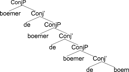 This insight is not new. For example, Karlsson (2010) has argued that there is no limit to the number of elements or structures that can be added at the same level in a sequence generated by iteration, implying that the underlying mechanism is relatively unconstrained. In contrast, there is very robust empirical evidence that the depth-increasing mechanism underlying the generation of hierarchically organized sequences (i.e., syntactic embedding) is not (fully) unconstrained, even when the derived recursive representation in question is of the tail type. In our view, these considerations make the syntactic structures hypothesized by Corver, namely (6)–(8), poor candidates for the representation of sequences such as 5(a–d). Uriagereka (2008) made similar points. He suggested that going down the Chomsky hierarchy (Chomsky 1956; see also Chomsky & Miller 1958; 1963; Berwick et al. 2011; Jäger & Rogers 2012; Hunter 2021) can solve the puzzle posed by iterative expressions to any theory that assumes an arbitrary mapping between syntax and semantics, from the simplest like “yo, yo, yo” (“me, me, me” in Spanish) to entire phrase iterations like “taza de café tras taza de café tras taza de café” (“cup of coffee after cup of coffee after cup of coffee”).