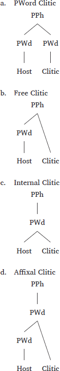 The term clitic is sometimes used in rather different ways depending on linguistic tradition and area of focus. I am here interested strictly in phonological clitics, which might be provisionally defined, following Anderson (2005: 13), as “prosodically deficient forms” (emphasis original), and which must be adjoined to a neighbouring phonological entity (the host) so that it can stand as part of some larger prosodic unit, namely part of a syllable, foot, prosodic word (PWord, PWd), or prosodic phrase (PPh). Since there are different kinds of prosodic deficiency, the exact relationship between a clitic and its host can be of several types. One influential model posits four types of clitic, reproduced here from Anderson (2005: 46):15