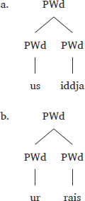 Space precludes an extensive discussion of all of Anderson’s types, but the category of PWord clitic (9a) needs to be considered further, since it plays an important role in the analysis developed below. The really essential point in the present context is that a PWord clitic is in some real sense a clitic (and has a host), but is nonetheless also a prosodic word. This may seem somewhat counter-intuitive, but such entities do seem to exist. An illustration of a probable PWord clitic in early Germanic comes from Gothic verbal “prefix” uz-, found in forms such as us·iddja “went out” and ur·rais “arose”. The underlying form uz- surfaces when a further clitic intervenes between “prefix” and root, as does uh “and” in uz=uh·iddja “and (he) went out”.17 The variant us- is produced by the active process of word-final devoicing in Gothic, which usually applies to “words” (in a phonological sense, therefore, prosodic words), and consequently implies that us- is its own PWord in us·iddja. At the same time, the prefix cannot simply be taken as a fully independent word, since it shows assimilation to the root-initial r- in ur·rais, a process that does not happen between adjacent words within a phrase.18 In other words, it would seem that us-, as a verbal “prefix”, has a status both as a prosodic word, and as a proclitic bound to its host in a relationship closer than that of two adjacent words in a prosodic phrase. In this light, it might be better to model us·iddja and ur·rais, and perhaps PWord clitics in general, not as forming a prosodic phrase (as in Anderson’s representation), but as constituting a larger prosodic word:19