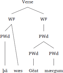 This could be scanned any of three ways by the word-foot theory: w/(x)Ssw, (x)w/Ssw, or ww/Ssw.14 Under the first option, the pronoun wē would be extrametrical, while under the second the adverbial hwæt would be. Russom (2022: 41, 48) also allows disyllabic light ww feet, and further principles allow a single word-foot to, at least under some circumstances, be instantiated by multiple words. That is, it is not inconceivable, under the general principles of the theory, that hwæt wē could constitute a single word-foot – compare, in different terms, Whitman (1993: 69–83) – equivalent to a single low-stress word such as under in Beowulf 710b: