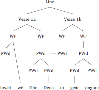 In (8), there is no doubt that the scansion begins with ww, since a single simplex word cannot under any circumstances contain within it a word-foot boundary. In hwæt wē, scansion as ww is only a possibility – but a possibility that interacts with the question of whether hwæt wē really should be analysed as two “words”, or if hwæt=wē, with an enclitic pronoun, might not be the right prosodic structure to posit here. The possibility of clitic structures being formed within light word-feet will be returned to below.