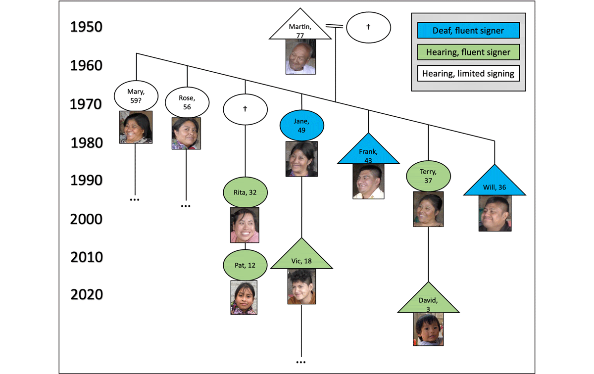 The focus of this study is Zinacantec Family Homesign (‘Z sign’), a sign language developed by deaf and hearing members of an extended family from Zinacantán, a Tsotsil (Mayan) speaking community of the highlands of Chiapas, Mexico (Haviland 2020a; German 2024a). A skewed kinship diagram for the family is shown in Figure 1. Each member is identified by a pseudonym, their age as of 2025, and a rough indication of their signing ability. The position of each signer is aligned with their year of birth as indicated along the vertical timeline on the left side of the diagram. Z sign began with the birth of the first deaf individual in the family, Jane, in 1976 (Haviland 2011). Unable to access the Tsotsil spoken by her caregivers, Jane began to develop homesigns. The second and third deaf siblings, Frank and Will, were born in 1982 and 1988, respectively. Among the hearing members of the family, there is a clear division between those who are younger than Jane and those who are older. Those who are younger than Jane (Terry, Rita, Vic, Pat, and David) all acquired Z sign from birth or early infancy and grew up using it as a home language. They are fluent signers who can communicate comfortably with the deaf siblings about a range of topics. By contrast, older hearing members of the family, such as the deaf siblings’ father Martin, and their older sisters, have only minimal signing skills. Though they can communicate with the deaf siblings at a basic level, they struggle to understand what the fluent signers say to each other (Haviland 2020a).