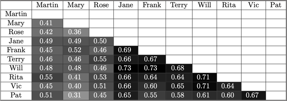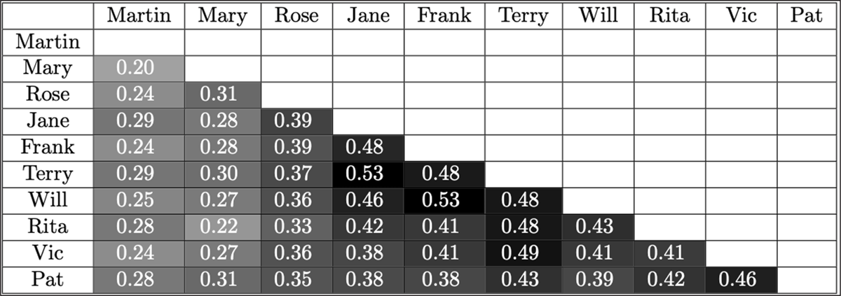The mean lexical similarity score for a pair of signers was 0.37 (SD = 0.09). Lexical similarity scores (averaged across time points) for all pairs of signers are presented in the form of a similarity matrix in Figure 6. As a visual aid, each cell has been shaded according to the similarity score for that pair of signers; darker shades represent higher scores. The highest scores appear to be concentrated among the core signers (Jane, Frank, Terry, Will, and Rita), with slightly lower scores among the intermediate signers (Vic and Pat), and the lowest scores among the peripheral signers (Martin, Mary, Rose). To assess the statistical significance of these differences, I conducted a one-way ANOVA comparing the average similarity scores of pairs the following groups: