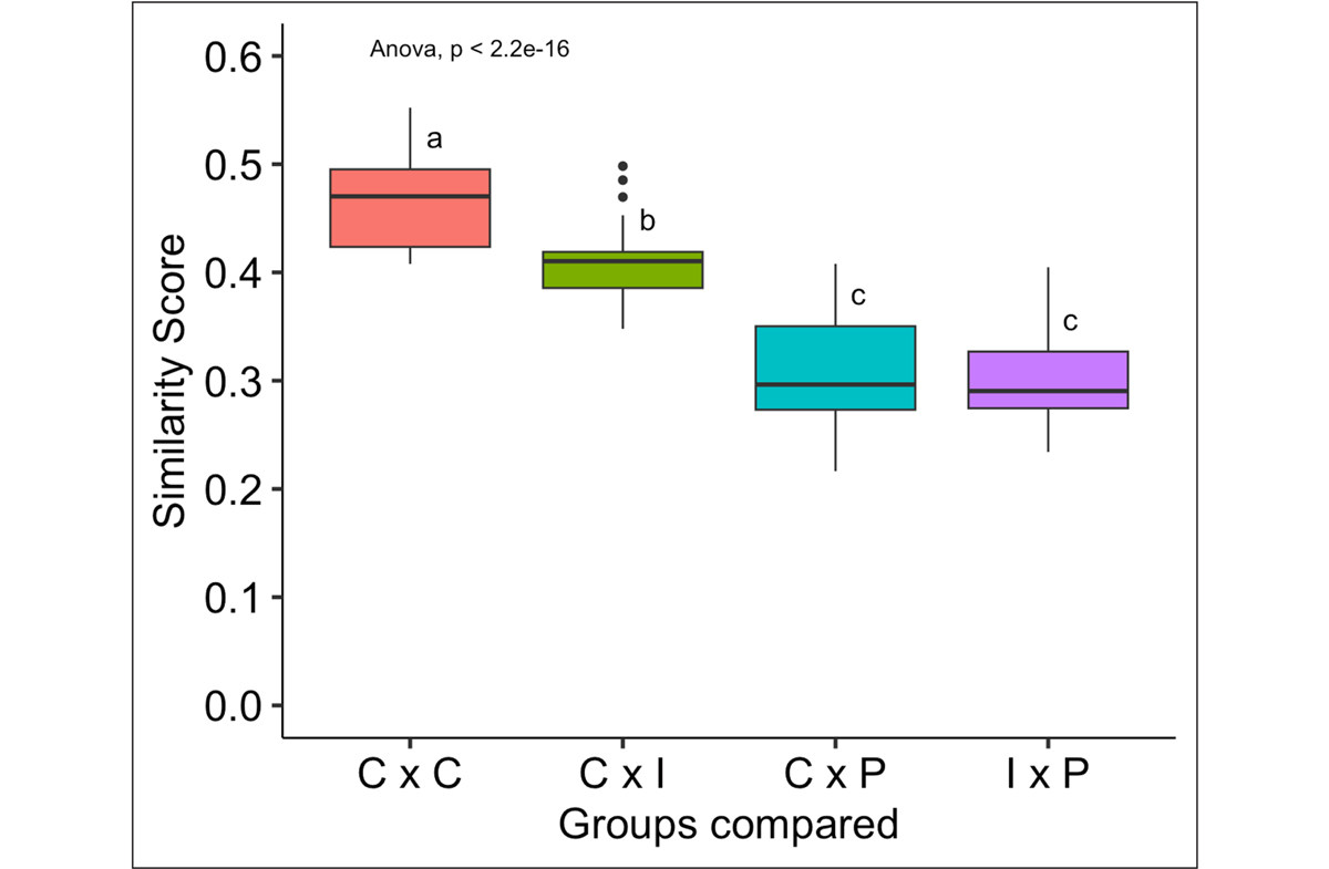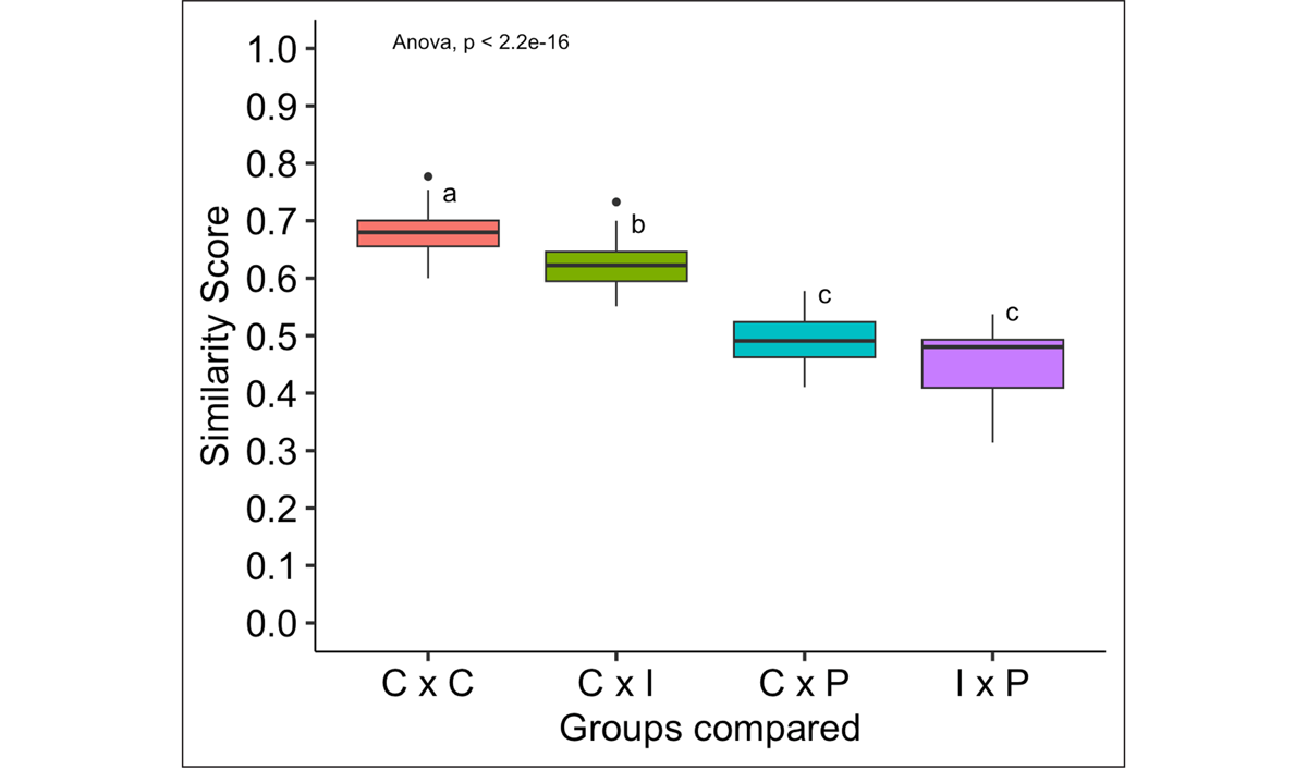 The groups IxI and PxP contained too few observations to be analyzed reliably with ANOVA, so they were excluded from the analysis.8 Similarity scores differ significantly across groups (F(3,71) = 49.77, p < .001). Post hoc pairwise comparisons (Tukey HSD) suggest that similarity scores of CxC pairs are significantly higher than similarity scores of CxI pairs, which are in turn higher than those of CxP or IxP scores. The latter two groups do not differ significantly. The results are shown in Figure 7.