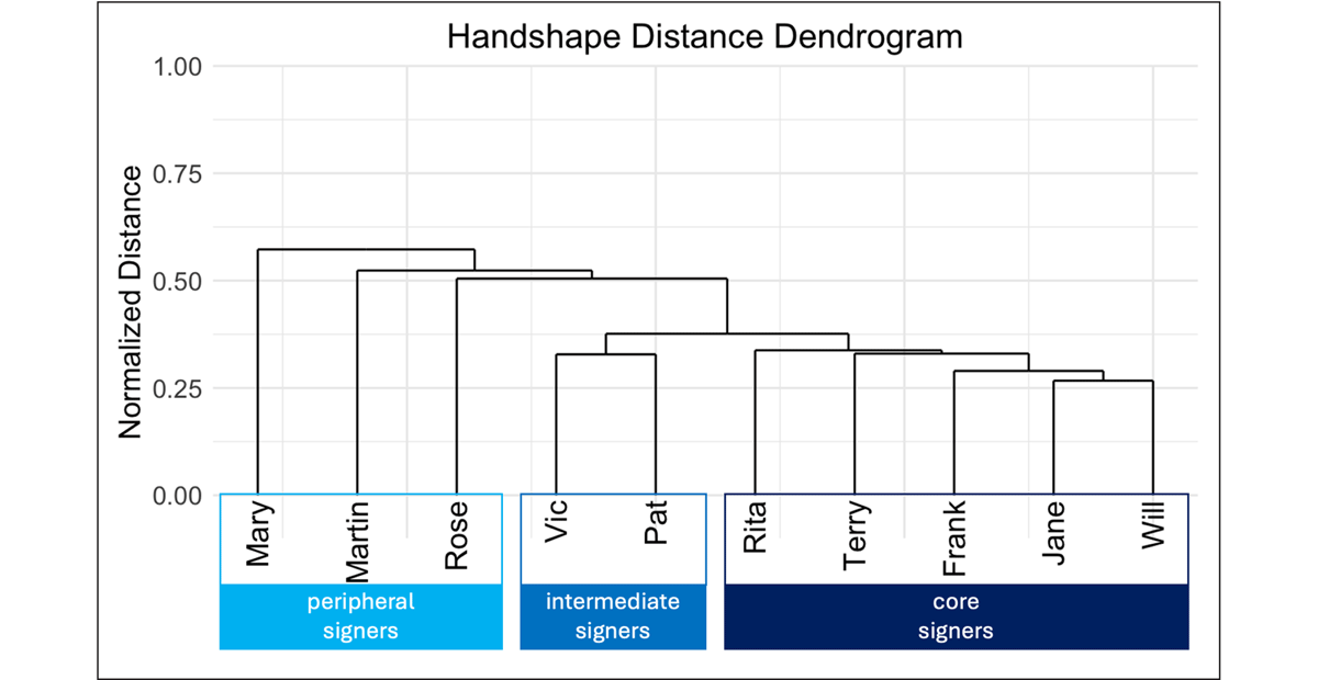 Within the core cluster, the four siblings (Jane, Frank, Terry, and Will) form a sub-cluster apart from their niece (Rita), just as in the lexical distance dendrogram. Again, this likely reflects the time that Rita spent away from her aunts and uncles in her childhood/adolescence. However, the two dendrograms diverge in the organization of the sibling cluster. In the lexical distance dendrogram, the siblings were divided by gender. Based on handshape, however, the three deaf siblings form a cluster apart from their hearing sister Terry. Thus, handshape preferences seem to be slightly more uniform among the deaf signers compared to the hearing signers, although the differences are admittedly small. Finally, among the deaf siblings, Jane and Will form a cluster apart from Frank. This is an unexpected result given (1) Frank and Will’s close relationship, and (2) their sharply negative assessments of Jane’s signing (Haviland 2013c; 2016; German 2024a;b).