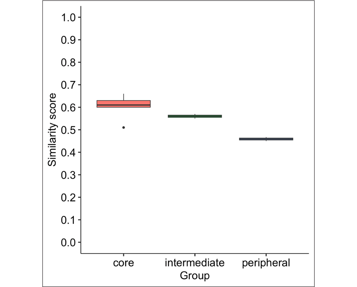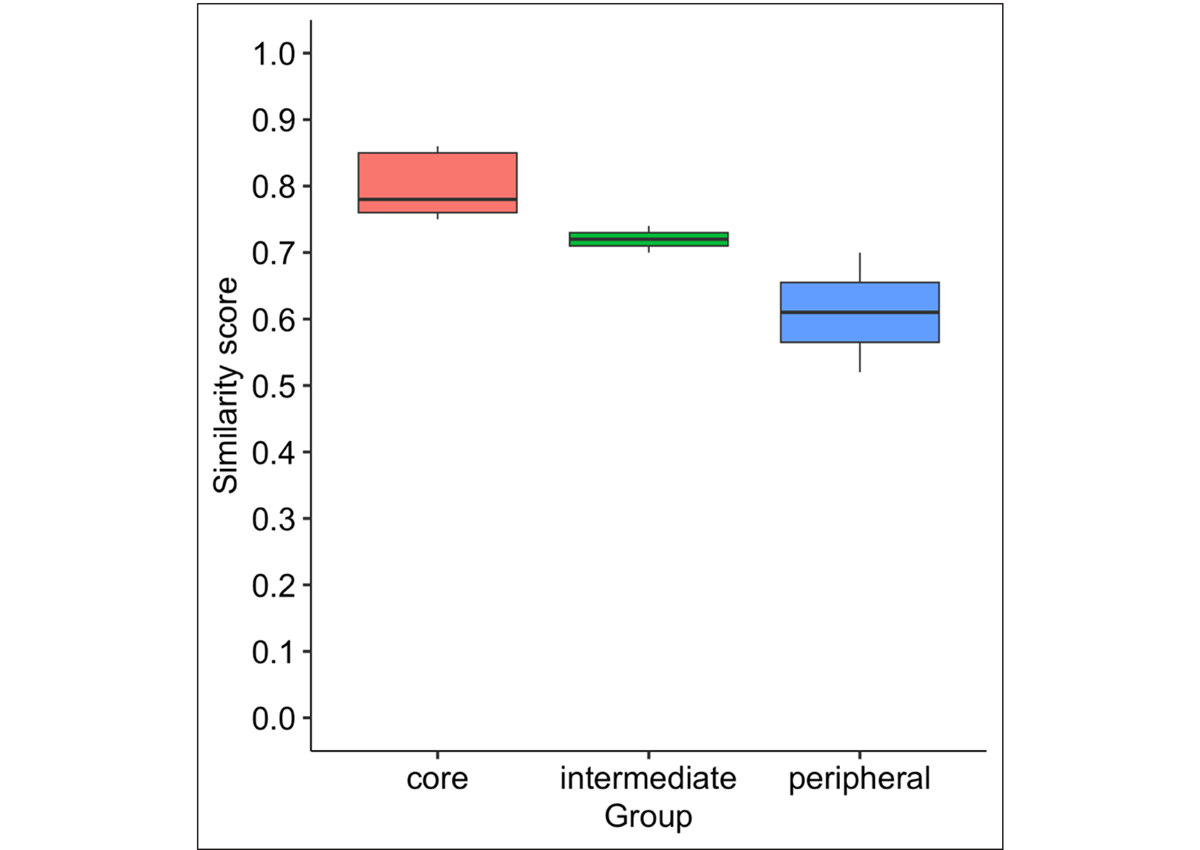 Another way to assess the stability of the lexicon is to examine lexical similarity within each signer over time. Accordingly, “self-similarity” scores were calculated by comparing each signer’s responses at Time 1 with his or her responses at Time 2, for a total of 1,232 observations. Figure 9 displays the self-similarity scores for each stratum. The core signers display the highest similarity scores (M = 0.60, SD = 0.05), followed by the intermediate signers (M = 0.56, SD = 0.01), and the peripheral signers (M = 0.46, SD = 0.01). These results indicate that the core and intermediate signers’ descriptions remained highly consistent across time points, while those of the peripheral signers were less consistent.