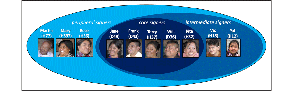 These three strata serve as a proxy for the amount of signed interaction different members of the family engage in. The core signers sign to each other with the highest frequency (daily) and share the most context. They regularly engage in in-depth conversations about a broad range of topics. The peripheral signers use sign relatively infrequently, and even then, only for communicating about basic matters (e.g., the location of objects, when events are going to take place, where individuals are going, etc.). The intermediate signers, as the name suggests, fall between the core and peripheral signers. They grew up signing on a daily basis, but they also went to school and therefore spent a significant amount of time outside of the presence of their deaf relatives using spoken languages (Tsotsil and Spanish) and forming social relationships outside of the family.