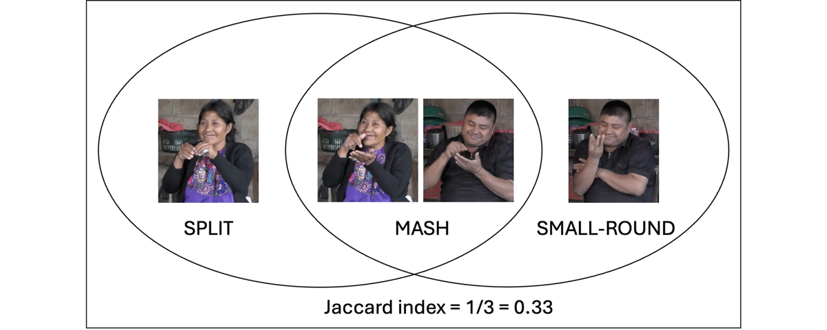 Signers’ responses typically consisted of multiple signs (mean = 2.29 signs). This presents an analytical challenge to comparing responses since lexical similarity cannot be calculated by simply deciding whether the signers produced the same sign for a given item. For the present study, signers’ responses were compared using the Jaccard similarity index, following previous studies (Mudd et al. 2021; Horton 2022; Lutzenberger et al. 2023). The Jaccard index is a measure of the similarity of two sets, calculated by dividing the number of items in the intersection of the sets by the number of items in the union of the sets (Fletcher & Islam 2018; Jaccard 1912). Including all signs produced by a signer avoids the problems associated with the researcher making judgements about which signs should be included. Nonetheless, it is quite likely that such responses are not simple lexical items, but phrasal descriptions of the stimuli. This is a limitation of the methodology in that we may not be directly accessing “the sign” for a concept. Future work should compare the elicited descriptions with data from spontaneous conversation.