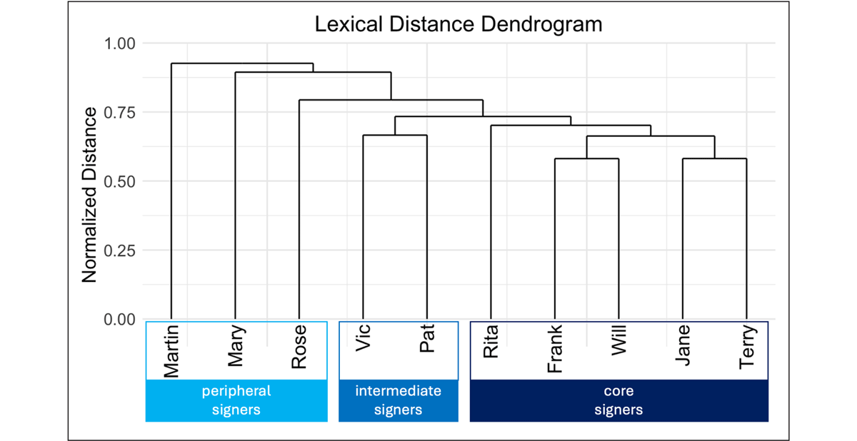 Several aspects of the dendrogram merit comment. First, its overall structure preserves the distinction between core, intermediate and peripheral signers. The core signers form their own cluster, as do the intermediate signers. This indicates that each group has their own distinct lexical preferences. At the next level up, the core and intermediate signers form a larger cluster, apart from the peripheral signers. Thus, despite their differences from each other, the core and intermediate signers are more similar to each other than they are to the peripheral signers. By contrast, the peripheral signers do not form a cluster, indicating that these three signers lack shared lexical preferences. This is consistent with the fact that they do not sign with each other. Rather, Rose (the youngest peripheral signer) is closest to the core-intermediate cluster, followed by Mary and finally Martin (the oldest peripheral signer). Thus, the degree to which each peripheral signer converges with the core/intermediate signers corresponds to his or her proximity to them in age.